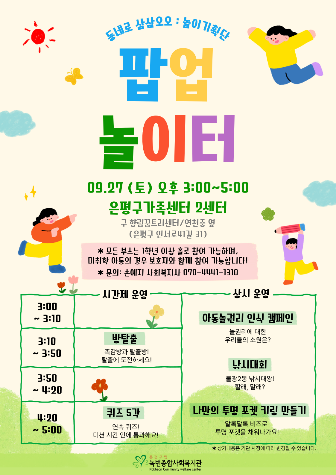 9/27(토) 오후 3시~5시, 은평구가족센터 2센터(연천중 옆)에서 <팝업놀이터>를 운영하오니,