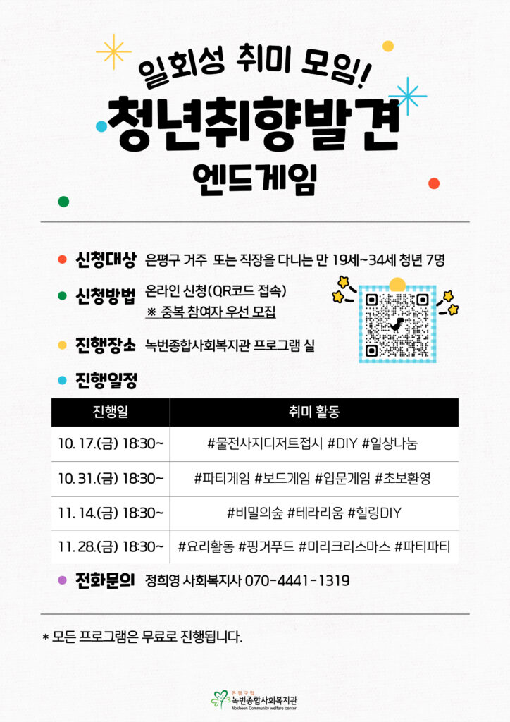 금요일 저녁, 녹번복지관에서 다양한 취미를 경험하며 이야기 나누는 소소한 일회성 모임에 청년 여러분을 초대합니다.