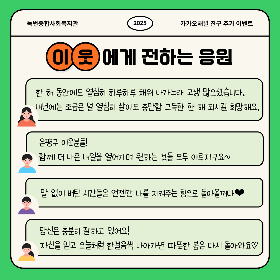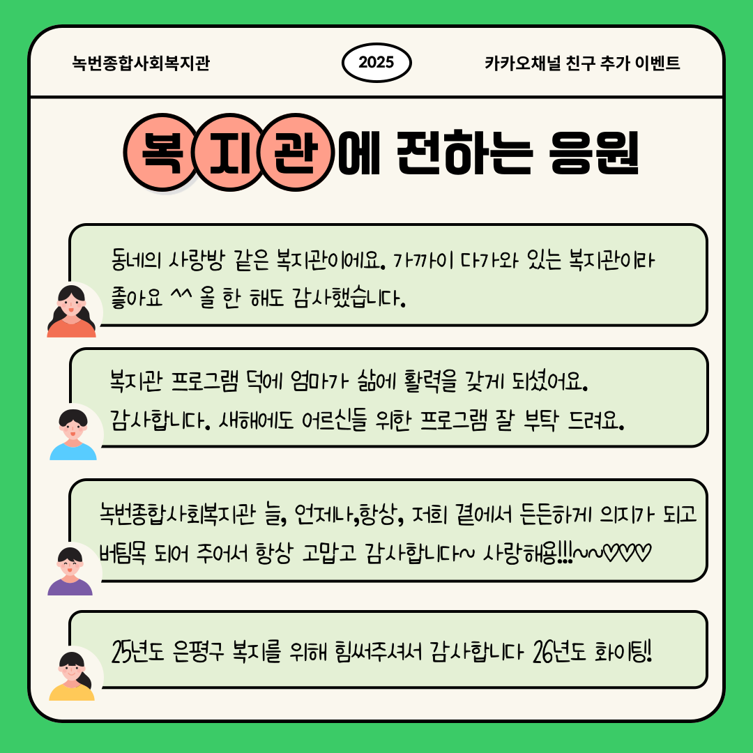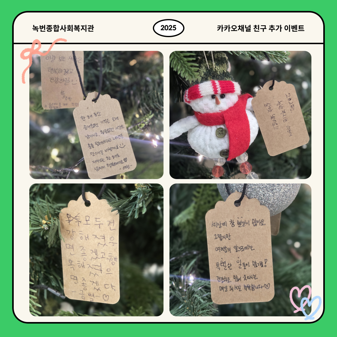 공지사항 복지관이야기 마을소식 주민의소리함 자료실 공지사항 복지관이야기 마을소식 주민의소리함 자료실 복지관이야기 [카카오채널] 이웃과 나눈 따스한 응원 한마디💌 소식 작성자 녹번 복지관 작성일 2025-12-29 16:27 조회 405 좋아요 0 싫어요 0 인쇄 « [고립은둔청년지원사업] 건강소모임 이야기 [동네로 삼삼오오] 2025 놀이기획단 수료식🎓 » 목록보기