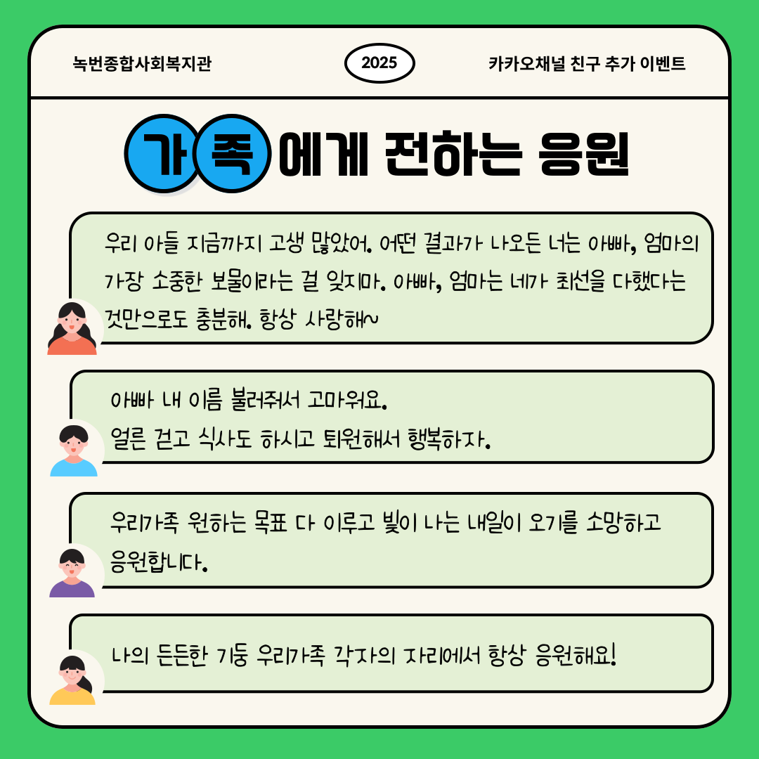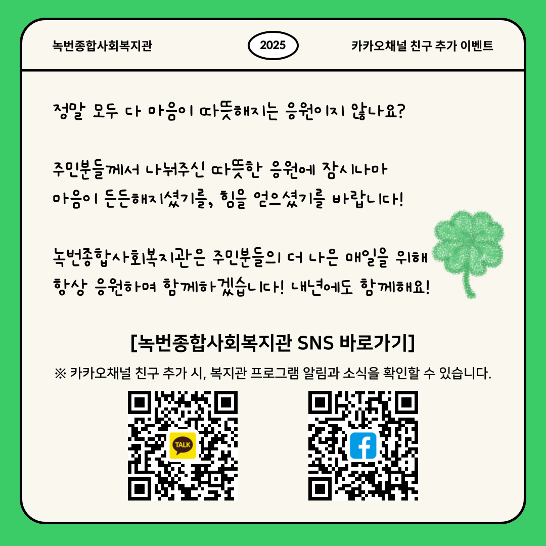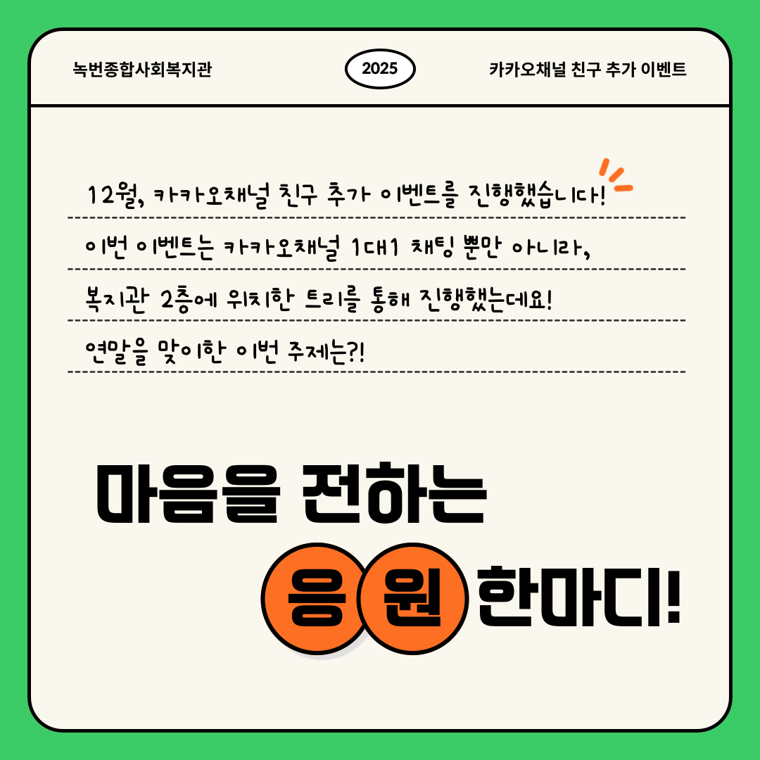 공지사항 복지관이야기 마을소식 주민의소리함 자료실 공지사항 복지관이야기 마을소식 주민의소리함 자료실 복지관이야기 [카카오채널] 이웃과 나눈 따스한 응원 한마디💌 소식 작성자 녹번 복지관 작성일 2025-12-29 16:27 조회 405 좋아요 0 싫어요 0 인쇄 « [고립은둔청년지원사업] 건강소모임 이야기 [동네로 삼삼오오] 2025 놀이기획단 수료식🎓 » 목록보기