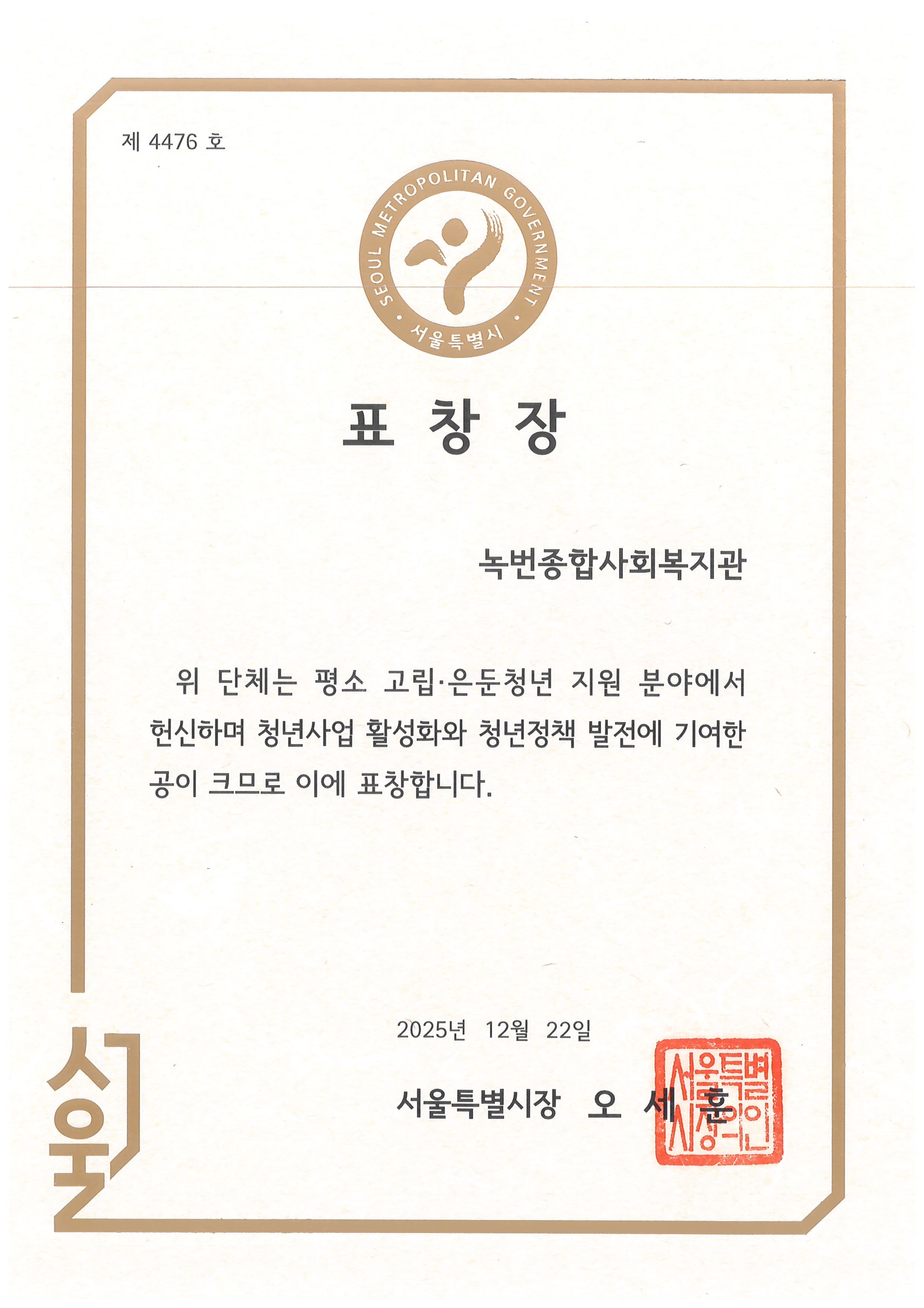 녹번종합사회복지관은 지난 2025년 12월 22일, 청년사업 활성화와 청년정책 발전에 기여한 공로를 인정받아 서울특별시장 표창(제 4476호)을 받았습니다.